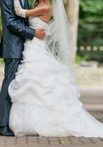 свадебное платье марка Pierre Cardin (Франция), всегда была авангардной, гламурной и модной. Невеста от "Пьера Кардена" — это сложный образ, завершенный в текстиле, это сочетание шелка, расшитого шифона, тафты, тюля и плиссированной органзы. Платье покупалось в салоне Malineli. Шикарное, цвет "айвори". Перчатки ручного расшива в подарок.